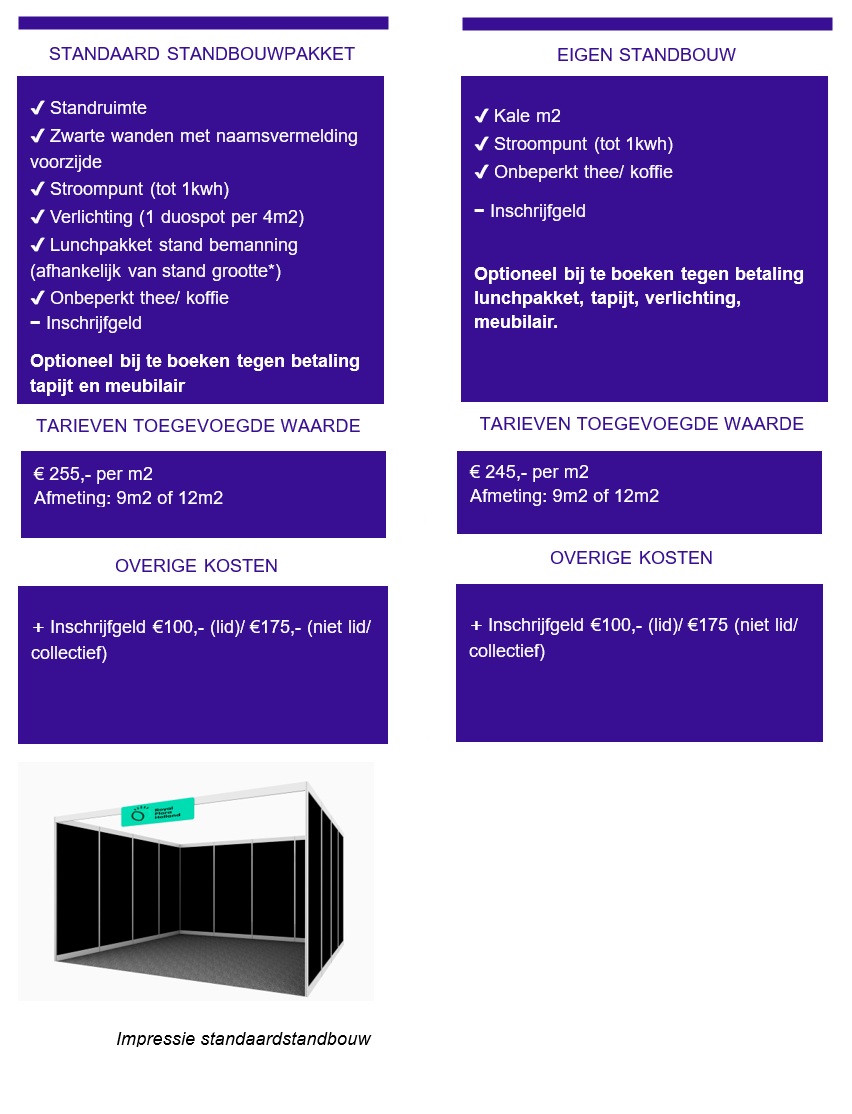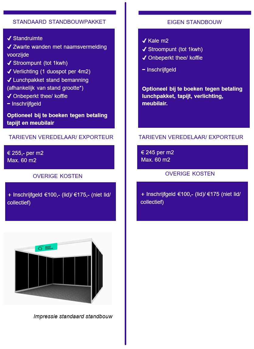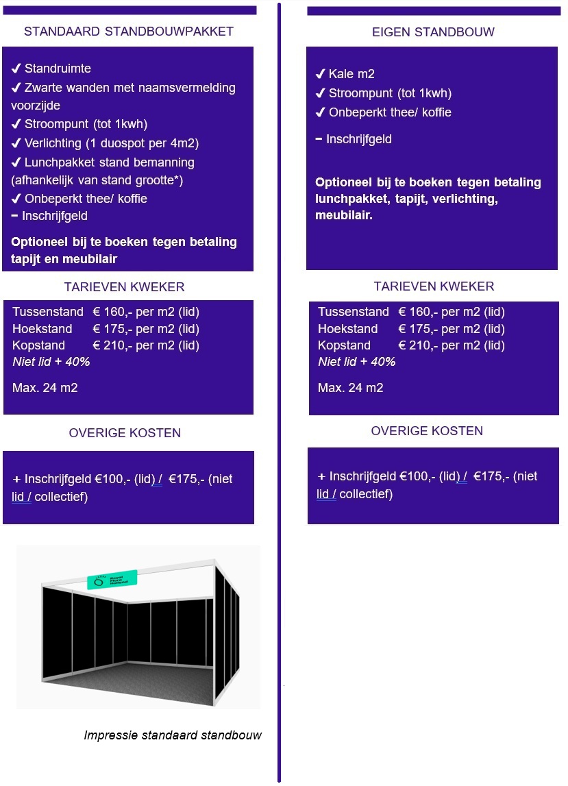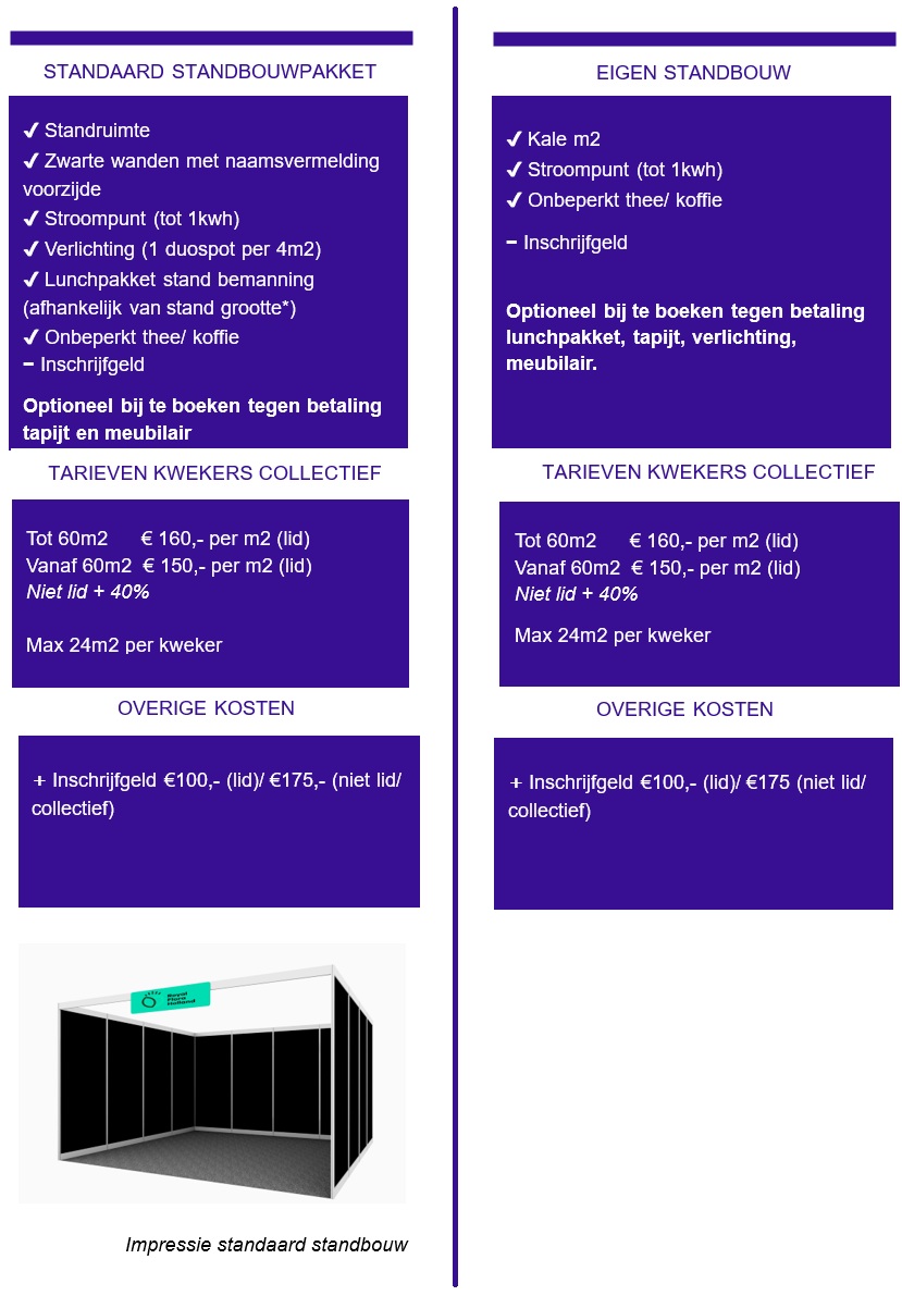 Per stand is er één (1) standnummer met de naam van de collectieve organisatie. Het is wel mogelijk om de deelnemende kwekers onder datzelfde standnummer op de deelnemerslijst te plaatsen.